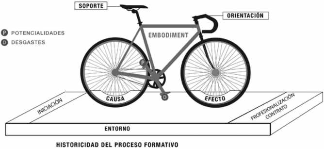 La subjetividad de las experiencias encarnadas-narradas, integra la vivencia del placer y el dolor, es decir, las potencialidades y los desgastes, ubicados simbólica- mente en el sistema categorial en los pedales, pues su relación es ambivalente en cada experiencia del ciclista. Ambivalencia que, para el caso del cuerpo ciclista, representa la capacidad de sufrimiento como una única y auténtica potencialidad del ciclista que se forma, coexistiendo la potencialidad y el desgaste durante el proceso formativo, éste que se cree, finaliza con la firma de un contrato profesional, pero que se desmiente en el experimentar las potencialidades y los desgastes aun siendo profesional, a medida que se afrontan los retos de las competencias en términos de los rivales, la distancia, la topografía y las condiciones climáticas, o de querer “conquistar” las tres grandes vueltas del ciclismo mundial, formulando así, una extensión de la historicidad de lo que se piensa que es el proceso formativo.