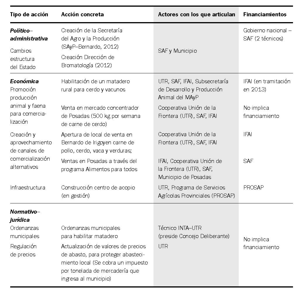 Para el logro de este objetivo, la gestión municipal llevó adelante una serie de acciones político–administrativas, económicas y normativo–jurídicas (Tabla 4) que se dirigieron a intervenir en algunos aspectos clave para la promoción de la producción y comercialización de alimentos de la AF. Dichas acciones, a su vez, se materializaron a partir de algunas articulaciones específicas entre actores locales y provinciales.