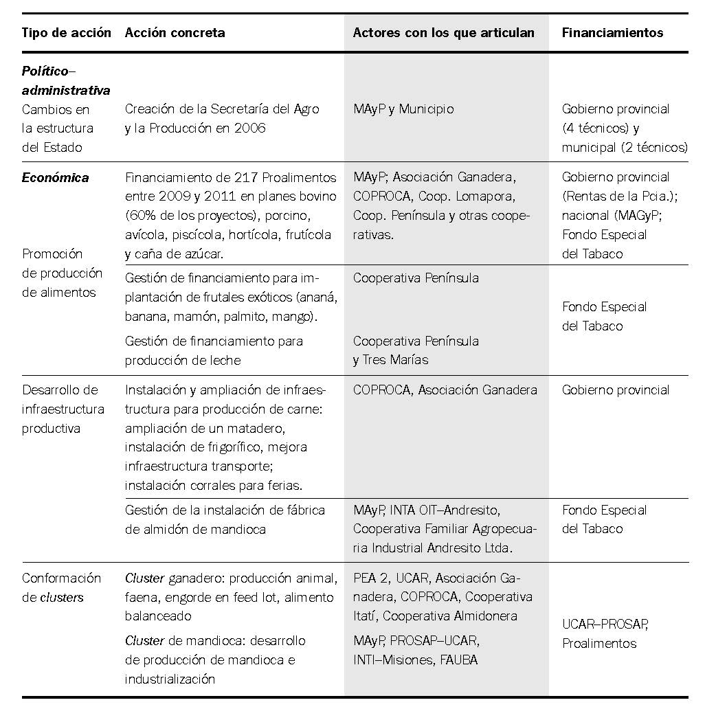 El gobierno local, a través de la Secretaría del Agro y la Producción (SAyP) creada en 2006, cumple el rol de gestión directa de la política provincial en el municipio, lo cual en parte se expresa en su propia estructura (cuenta con cuatro técnicos que pertenecen al Ministerio del Agro y la Producción —MayP— de la provincia y dos técnicos que son empleados del municipio). Las actividades que se llevan adelante desde esta dependencia son justamente trabajos de gestión de ciertos instrumentos de políticas que se definen desde el ámbito provincial y ciertas dependencias del gobierno nacional (ver Tabla 2).