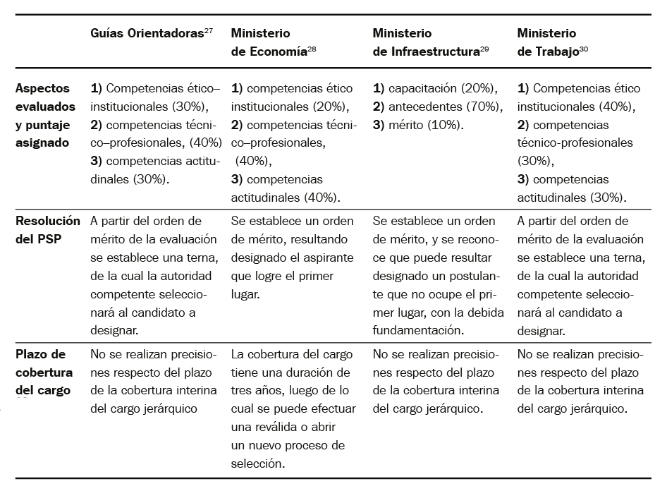 Frente a la suspensión de los concursos previstos en ley provincial de empleo público, desde hace al menos veinte años, la política de los PSP para la cobertura de los cargos jerárquicos interinos constituye una elipsis: quiere parecerse un concurso, toma los recaudos de un concurso pero no lo es ni en cuanto a la valuación de los méritos, ni en cuanto a sus garantías ni respecto a la universalidad ni a su estabilidad. En efecto, diseñada de manera provisoria a la espera de la reforma de la Ley N° 10.430, se institucionalizó como el procedimiento para la cobertura de los puestos jerárquicos de Jefe de Departamento y Subdirectores. Si bien la política constituye un avance en materia de profesionalización, debido a que el proceso de selección se basa en criterios de méritos profesionales; es, finalmente una norma flexible ya que permite continuar con el régimen de discrecionalidad e interinato de las normas de excepción.