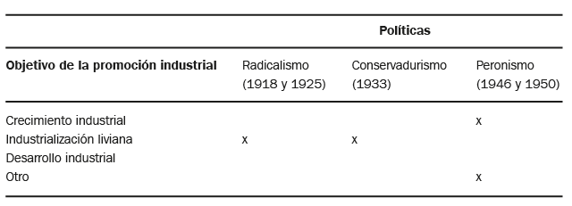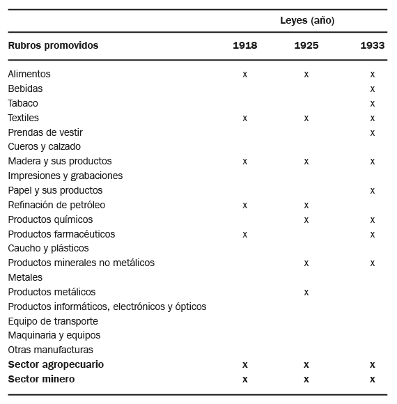 Por su parte, recordemos que las tres primeras leyes de fomento apelaron a la desgravación impositiva y al pago de sumas dinerarias como instrumentos de fomento. Aquí existe una diferencia sustancial entre las políticas del radicalismo y la de los conservadores, ya que las dos primeras apoyaron a través de la exención de tributos a toda actividad industrial nueva que se asentara en el territorio, mientras que la tercera enlistó las materias primas que las industrias nacientes debían manufacturar para ser beneficiarias de esta ayuda. En consecuencia, también caben a las políticas de fomento del radicalismo las advertencias vertidas en cuanto a las consecuencias de estimular el desarrollo de cualquier tipo de industria. Como resultado de lo antedicho, la política de fomento de la década del treinta presenta una mayor cantidad de rubros fabriles específicos sobre los que ejerció apoyo; no obstante, se presenta una clara diferenciación entre el tipo de industrias que favoreció a través de uno y otro mecanismo de fomento.