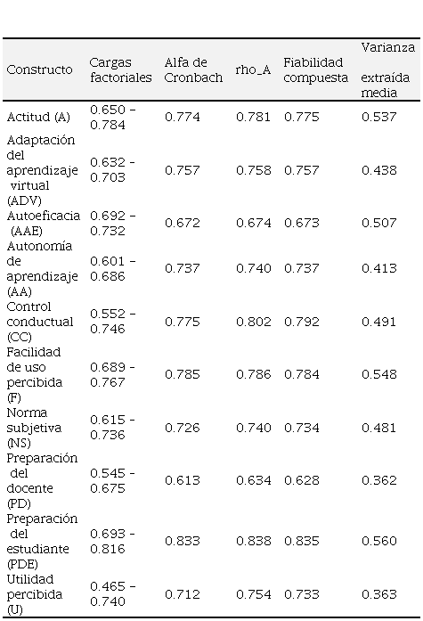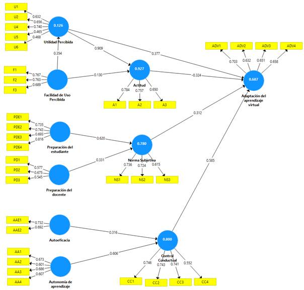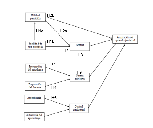 Por último, la utilidad percibida del aprendizaje virtual, representada en el mejoramiento del desempeño académico, se refleja en un aumento de la productividad académica, facilidad en el estudio del contenido de los cursos, acceso en tiempo real y la mejora del contacto con los docentes, esta relación también es positiva respecto a la adopción del aprendizaje virtual.