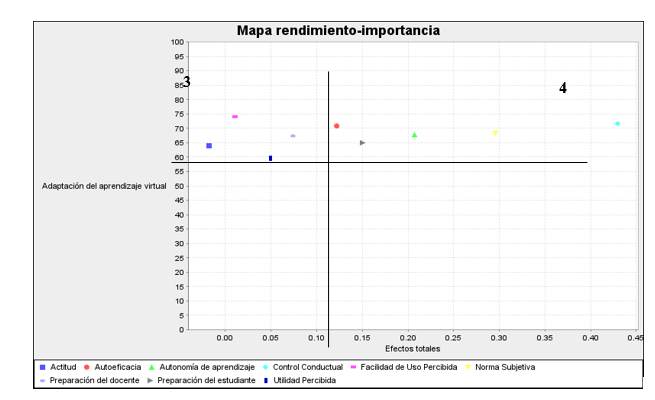 advierten los indicadores de Autoeficacia, Preparación docente y Facilidad de uso percibida; son menos importantes, empero poseen un alto rendimiento. Por último, el cuarto cuadrante refleja indicadores importantes (Control conductual, Norma subjetiva y Autonomía de aprendizaje), con un rendimiento y desempeño elevados. Por lo tanto, se deberían plantear estrategias orientadas a estos tres últimos para así aumentar la Adaptación de aprendizaje virtual.