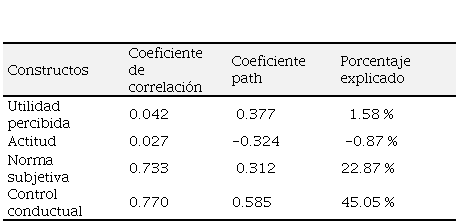 En la Tabla 6, se puede observar que en su mayoría los constructos presentan una relación sustancial, a excepción del constructo Utilidad percibida, cuya relación no pasa el valor umbral para ser considerado mínimamente como débil. El constructo con mayor explicación por parte de sus variables es el de Actitud seguido por Control conductual. A continuación, se realiza la descomposición del coeficiente de determinación, para conocer el porcentaje de explicación de las variables predictoras a cada constructo.