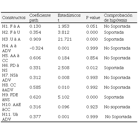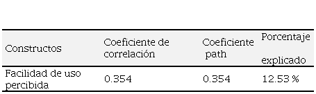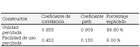 Como se puede observar en la Tabla 7, el constructo Utilidad percibida es explicado en un 12.53% por la Facilidad de uso percibida y el porcentaje restante explicado por variables que no fueron estudiadas.
