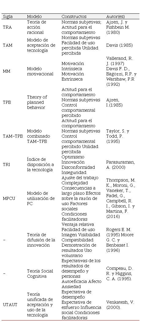 Los avances tecnológicos siempre jugarán un rol vital en el campo de la administración. El progreso tecnológico alberga también la diseminación del conocimiento. Pero, hasta que este no sea utilizado o aceptado, la tecnología se convierte en algo innecesario (Oye, D., A. Iahad. y Ab.Rahim, N. Z., 2012). Dada la importancia de los avances tecnológicos a lo largo del tiempo, es necesario el análisis de su adopción evitando que estos sean considerados innecesarios, como exponen los autores. El término Adopción se aplica a un nivel individual, la difusión puede ser entendida como la adopción por las masas. La adopción tecnológica conducirá a la difusión (Sharma, S., Hasteer, N., Mishra, S. P. y Van Belle, J. P., 2016). Más aún, el entendimiento respecto a la adopción tecnológica es de suma valía y, por ende, fundamental su definición. Para Carr, la adopción tecnológica hace referencia a la etapa de selección de la tecnología para el uso de un individuo o una organización (Carr Jr, V. H., 1999). El autor indica que la adopción toma en cuenta la elección de la herramienta tecnológica de una persona o empresa para su uso; no solo se enfoca en el uso del instrumento, sino en su análisis. Por otro lado, la adopción tecnológica puede ser definida como la voluntad dentro de un grupo de usuarios para utilizar la tecnología hacia su beneficio (Samaradiwakara, G. D. M. N. y Gunawardena, C. G., 2014). Gracias a las definiciones anteriores podemos concluir que la adopción tecnológica está relacionada con la intención de seleccionar y utilizar herramientas tecnológicas con el objetivo de obtener algún beneficio, el cual puede darse en distintos ámbitos. Muchos estudios han revelado que la adopción tecnológica no se relaciona con los aspectos tecnológicos por sí solos; empero ha ido evolucionando hacia un proceso mucho más complejo que involucra otras dimensiones: la actitud del usuario y su personalidad Venkatesh, V., 2000; Venkatesh, V., Thong J. Y., y Xu, X., 2012 ), influencia social (Ajzen, J. y Fishbein M. 1980), confianza (Gefen, Karahanna y Straub, 2003) y numerosas condiciones facilitadoras (Thompson, M. K., Moroni, G., Vaneker, T., Fadel, G., Campbell, R. I., Gibson, I. y Martina, F. , 2016). Entonces se puede inferir que los factores que influencian la aceptación de una determinada tecnología son muy variados y estudiados por diversas investigaciones (Gu, Ja-Chul y Lee, Sang-Chul y Suh, Yung., 2009; Kim, Gi., Shin, Bongsik y Lee, Ho., 2009; Luarn, P. y Lin, H.H., 2005; Santos, D., Veiga, R. y Moura, L., 2010 y Venkatesh, V., 2000) que buscan proponer modelos aclaratorios de tal aceptación. En la Tabla 1, se muestran los diversos modelos de aceptación de tecnología, con sus respectivos constructos, propuestos para analizar la aceptación de tecnología.