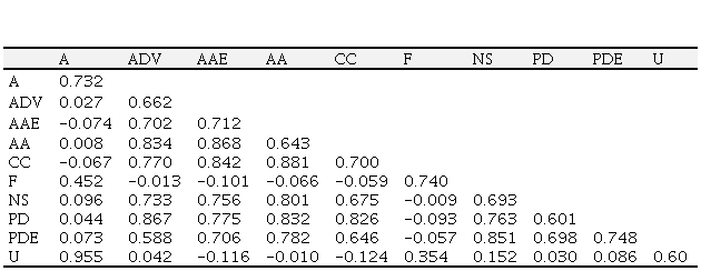 Una vez eliminados los indicadores, se evaluó la consistencia interna y validez convergente de ambos modelos propuestos. La Tabla 3 hace referencia a los criterios de evaluación del modelo integrado, en el cual se observa que las cargas factoriales de los indicadores pertenecientes a los distintos constructos oscilan entre 0.465 y 0.816. En su mayoría, los constructos cumplen con los valores umbrales den todos los criterios. Si bien la varianza extraída media en algunos constructos es menor al valor umbral 0.5, la fiabilidad compuesta en todos los constructos es mayor a 0.6. Entonces, los valores se consideran aceptables.