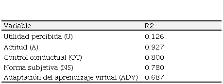 Por último, en la Tabla 11, se puede observar que la Adaptación del aprendizaje virtual es explicada en 45.05% por el Control conductual; en un 22.87%, por la Norma subjetiva y, en un porcentaje mínimo de 1.58%, por la Utilidad percibida.