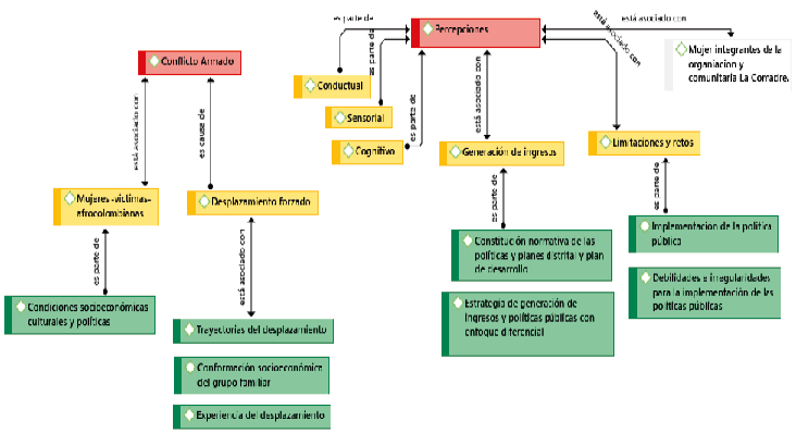 En este sentido, el análisis de las categorías se basó en la codificación e interpretación de los datos y relatos obtenidos relacionándolos con las categorías establecidas, tomando como punto o eje central las categorías de desplazamiento forzado, percepciones y generación de ingresos quienes establecen el cuerpo y sentido de la investigación, a su vez, para realizar el análisis de dichos elementos se recurrió directamente con el análisis de los datos e interpretación de los mismos en relación a la revisión literaria.