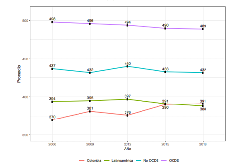 En relación con el estudio de 2015, el puntaje promedio de Colombia pasó de 390 a 391 puntos, lo cual demuestra un aumento no significativo y equivalente a un punto. Lo anterior apunta que se han cerrado las brechas entre Colombia y los diferentes grupos de comparación. En 2006 la brecha entre Colombia y el promedio latinoamericano era de 24 puntos a favor del agregado, entretanto que en 2018 esta diferencia fue de tres puntos a favor del país.