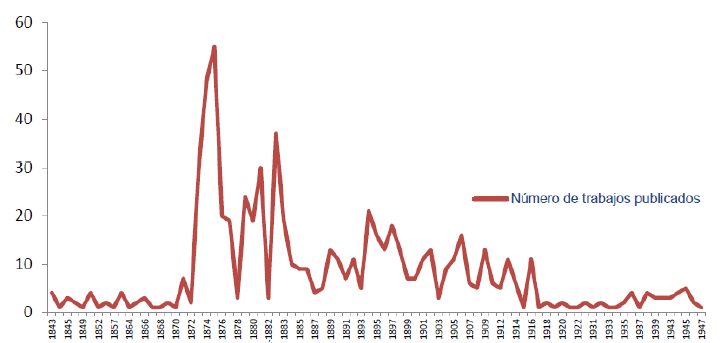La gran cantidad de contribuciones publicadas por estos cinco ingenieros a lo largo de su vida académicamente activa se inscribe en un período que va de 1843 a 1947 (Figura 1), es decir, sus contribuciones cubrieron un siglo de la evolución de la ciencia geológica en México bajo el apoyo del gobierno Porfirista (1876-1911), aunque el período de publicación de mayor auge fue entre 1870 y 1916, descendiendo en años posteriores debido al movimiento revolucionario que además de mermar la realización y preparación de trabajos geológicos, provocó la disminución en la actividad editorial. Debemos entender en este sentido que su gran producción son los inicios de las ciencias geológicas de nuestro país y, por ello, su aportación ha contado con gran impacto nacional e internacional hasta nuestros días, sobre todo en la conformación de colecciones de especímenes de rocas y fósiles y la descripción del territorio nacional.