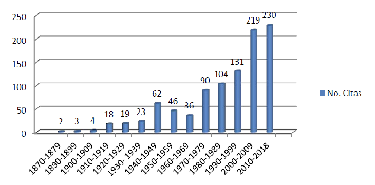 Del total de los 720 trabajos producidos por estos cinco ingenieros, únicamente 166 contribuciones realizadas, ya sea en forma individual o en coautoría entre ellos, tienen presencia en el GS. 136 de éstas aparecen citadas, alcanzando la cantidad global de 1,096 citas que muestran un comportamiento en ascenso constante durante su período de citación que va de 1870 al 2018 (Figura 2), cabe aclarar que 109 de las 1,096 citas no están reflejadas en el gráfico por no especificar el año. Como se puede apreciar, más de la mitad del total de las citas se concentra en las últimas cinco décadas; es decir, de 1970 a la fecha, lo cual indica claramente que la producción científica de estos ingenieros precursores cada vez es citada con mayor frecuencia.