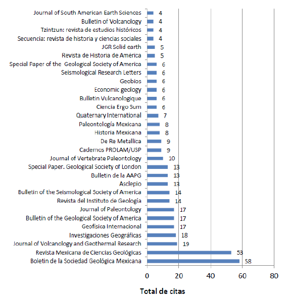 En la Figura 5 se aprecia cuáles son las 30 revistas de los 205 títulos enlistados en las tablas 5 y 6, que concentran el mayor número de citas por publicación y van desde 58 hasta 4 citas. Las 175 revistas restantes que no están representadas en el gráfico tienen entre 1 y 3 citas por revista. Como puede observarse hay revistas tanto nacionales como internacionales; entre las primeras destacan revistas editadas en la UNAM, como la Revista Mexicana de Ciencias Geológicas y su antecesora, la Revista del Instituto de Geología, Paleontología Mexicana, Geofísica Internacional e Investigaciones Geográficas, así como otras fuentes nacionales especializadas en las ciencias geológicas, como es el Boletín de la Sociedad Geológica o especializadas en temas históricos como son Historia Mexicana, Secuencia o Tzintzun, inclusive una revista multidisciplinaria como es Ciencia Ergo sum.