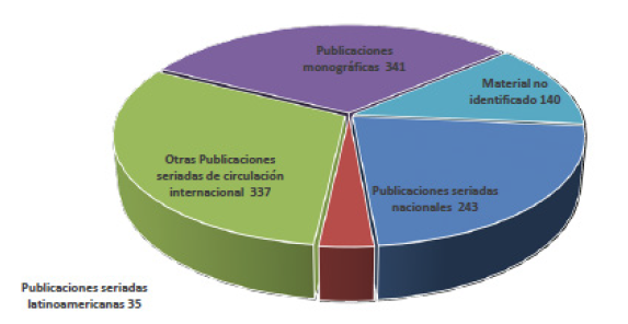 Con respecto a las fuentes citantes de los trabajos de los cinco ingenieros, se identificó que de las 1,096 citas recibidas (Figura 4), más de la mitad de ellas, es decir, 615 citas provienen de artículos, los cuales quedan distribuidos entre publicaciones seriadas internacionales, publicaciones mexicanas y en menor grado, en revistas latinoamericanas. También hay 341 citas que aparecen en obras monográficas, tales como libros, capítulos de libros, o memorias de congresos, libretos guías, tesis doctorales e inclusive enciclopedias. Hubo 140 citas cuyas fuentes citantes no pudieron ser identificadas para su clasificación, por aparecer citadas bibliográficamente de manera incompleta.