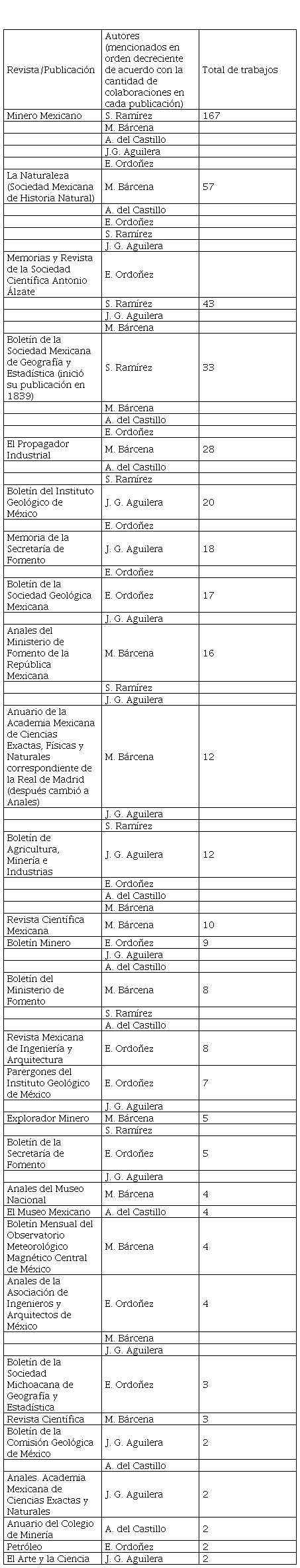 Elaboración propia con base en la información de las bibliografías recopiladas por Morelos Rodríguez (2012), Rubinovich Kogan (1991) y Martínez Portillo (1950).Sus contribuciones se difundieron principalmente en revistas científicas, anales o boletines (Tabla 1), cuya gran mayoría, y conforme a la época, estaban editadas por sociedades científicas: También publicaron en otros medios: folletería, almanaques, periódicos y semanarios de la época, sin olvidar los trabajos cartográficos, como planos, cortes, croquis y cartas generados como parte de sus investigaciones. En la misma Tabla 1, se muestra cuáles fueron las publicaciones científicas en las que contribuyeron estos cinco hombres de ciencia con mayor frecuencia, encontrando en ella el total de trabajos publicados por título.
