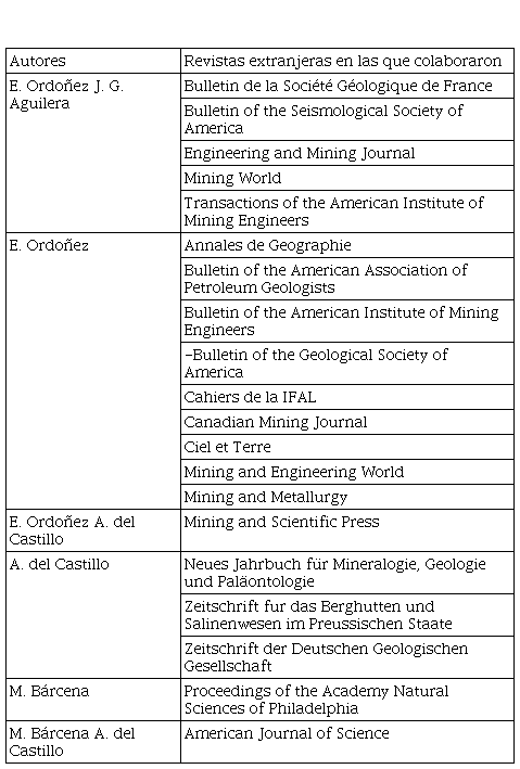 elaboración propia con base en la información de las bibliografías recopiladas en los trabajos de Morelos Rodríguez (2012), Rubinovich Kogan (1991) y Martínez Portillo (1950).Hubo otras publicaciones de la época en las que también colaboraron con al menos una contribución, así por ejemplo tenemos que Antonio del Castillo publicó en la Revista Minera Industrial; M. Bárcena colaboró en los Anales de la Secretaría de Fomento, Colonización e Industria; José G. Aguilera publicó en Revista Científica Industrial y Ezequiel Ordoñez colaboró en Revista Geográfica del Instituto Panamericano de Geografía e Historia, Irrigación en México y Boletín del Petróleo. Podemos señalar que el mayor porcentaje de las contribuciones de cada uno de estos ingenieros quedo registrada básicamente en publicaciones científicas nacionales y varias extranjeras, y algunos de sus trabajos fueron reseñados en otros idiomas, reimpresos o publicados como edición facsimilar en años posteriores. Gracias a su interés por publicar su aportación queda como legado para la formación de nuevas generaciones en las ciencias geológicas y además permitieron que a nivel mundial se conociera el trabajo que se realizaba en México por su participación en congresos en donde asistían los especialistas del momento.