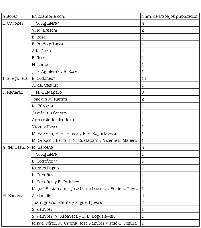 elaboración propia con base en la información de las bibliografías recopiladas en los trabajos de Morelos Rodríguez (2012), Rubinovich Kogan (1991) y Martínez Portillo (1950).* De acuerdo con las fuentes consultadas aparecieron algunas discrepancias en la cantidad de trabajos enlistados en coautoría entre (J. G. Aguilera y E. Ordoñez)** Hace referencia a un plano Geológico y petrográfico de la Cuenca de México, publicado por A. del Castillo y E. Ordoñez en 1893 (Morelos Rodríguez, 2012).Son pocos los trabajos que publicaron en coautoría entre los mismos autores aquí abordados, pero puede establecerse que los que más aportaciones realizaron en conjunto fueron, por un lado, Antonio del Castillo con Mariano Bárcena, y Ezequiel Ordoñez con José Guadalupe Aguilera durante la última década del siglo XIX, por otro.