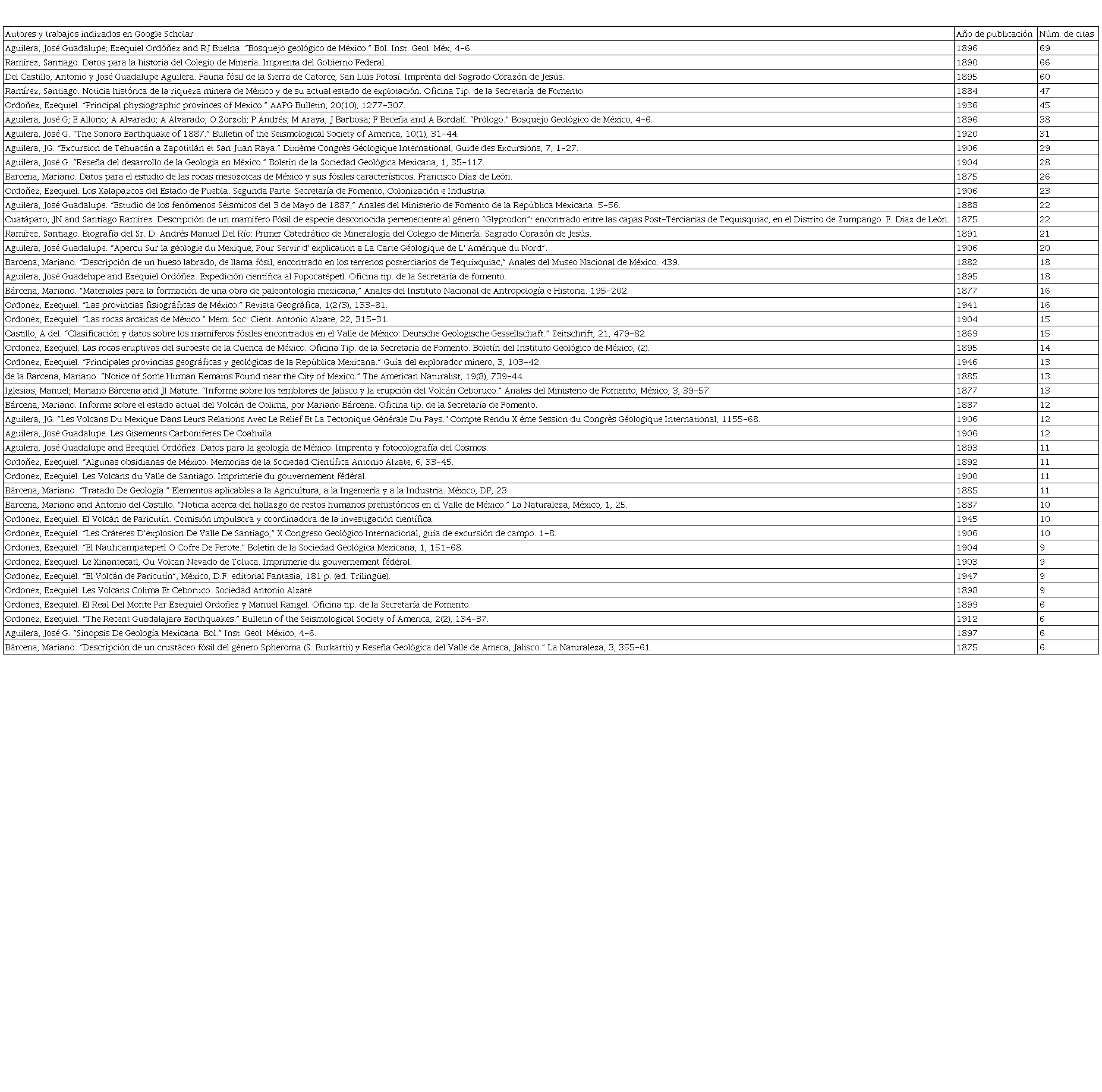 Las contribuciones de estos autores, eliminando los trabajos duplicados por ser coautorías entre ellos, fueron 166 trabajos con presencia en el GS, de los cuales 136 trabajos cuentan con citas y cuya suma global de citas es de 1,096. Para ser literatura histórica se nota la influencia que se tiene en las nuevas generaciones, pero además existen otras muchas citas que no son recuperables debido a que la literatura de la época se encuentra publicada en diversas fuentes, las cuales no están indizadas en bases de datos o catálogos y cuya búsqueda se está trabajado de manera física revisando cada una de las publicaciones de la época que permite el acceso.