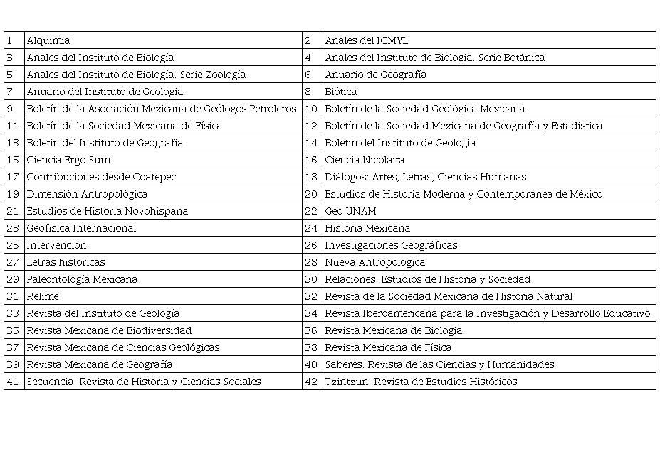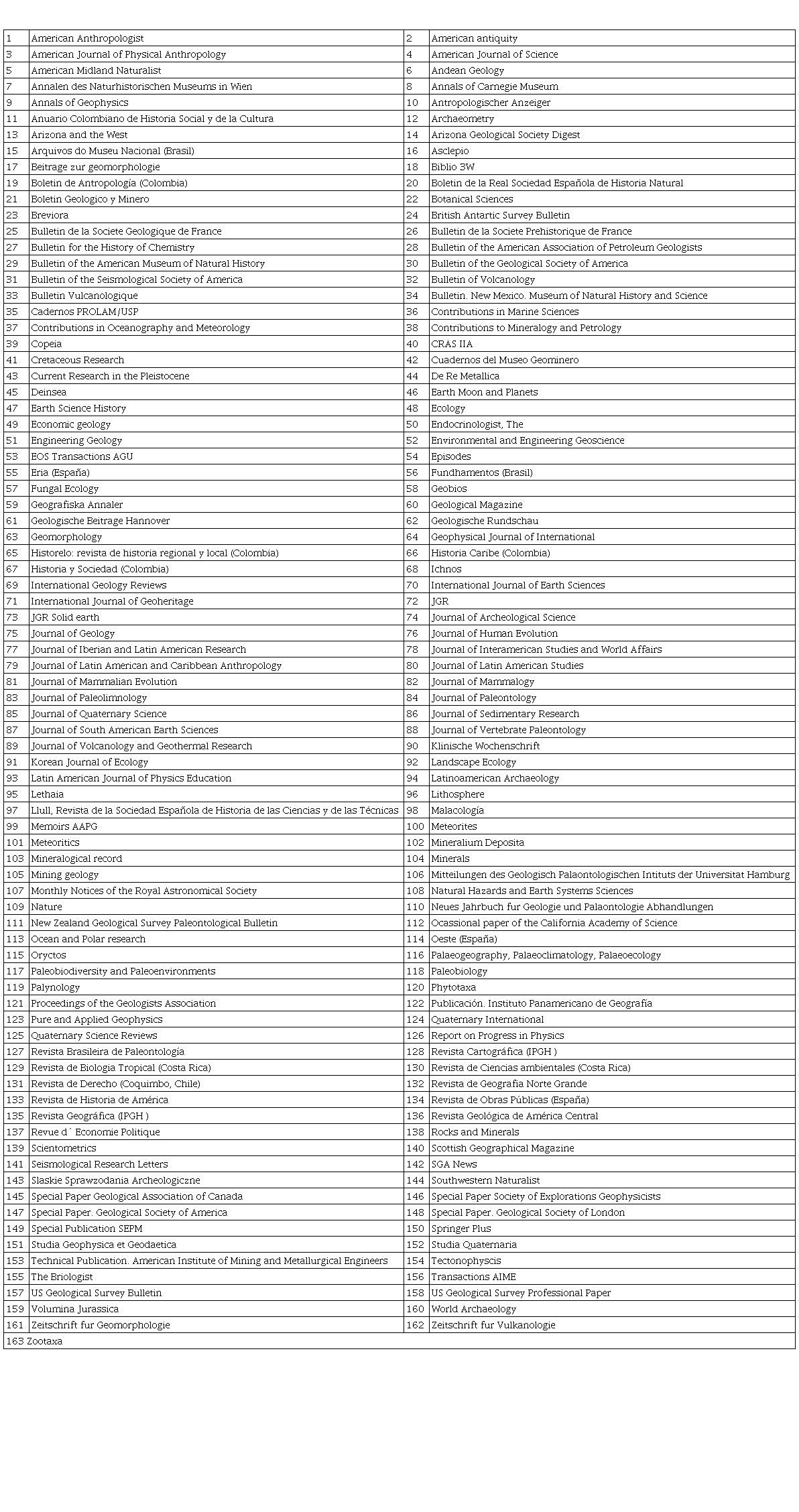 En total son 205 títulos de publicaciones seriadas citantes de los trabajos de estos cinco ingenieros estudiados, de los cuales 163 corresponden a revistas internacionales (Tabla 5) y 42 corresponden a títulos mexicanos (Tabla 6). La gran mayoría son publicaciones de circulación internacional, están incluidas en el Journal Citation Reports (JCR)[55] y son fuentes especializadas en diversas áreas de las ciencias geológicas u otras disciplinas como la historia, la arqueología y las humanidades, inclusive en áreas comúnmente menos relacionadas, como la cienciometría o la economía política.