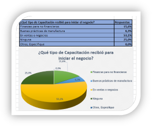 Con referencia a esta pregunta se determinó que el 53,10% de la población señala que ha recibido capacitaciones básicas sobre ventas y negocios antes de comenzar con la creación del emprendimiento, de esta manera sustentan conocimientos sobre el área comercial así mismo un 25% de la población detalla que no ha recibido ningún tipo de capacitación para la creación de su emprendimiento lo que nos da entender que nunca conoció el verdadero fin de la generación de nuevos ingresos y a su vez se puede evidenciar por algunos negocios que se generan en la cuidad tienden a cerrar muy prontamente, es decir por la falta de información contable, por otro lado el 15,6% de los encuestados denotan que han recibido capacitaciones sobre finanzas para no financieros al igual que un 6,3% de la población determina que ha realizado procesamiento en prácticas en manufactura de forma general, por tanto se evidencia que existe falencias en los individuos que generan emprendimientos puesto que algunos no recibieron orientación contable y empresarial antes de iniciar un negocio personal o propio.