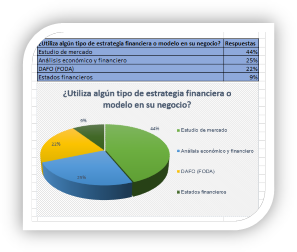Se evidencia que un porcentaje alto del 44% de propietarios de negocios manejan la estrategia financiera del estudio del mercado con respecto a sus posibles competencias para crear un plus adicional mientras que el 25% determina el estudio de un análisis económico y financiero por otro lado, el 22% utiliza el modelo de negocio sobre un análisis DAFO(FODA) conociendo las ventajas y desventajas que tiene su negocio y tecnificando sus amenazas para convertirlas en posibles fortalezas él y de la misma manera vemos que el 9% de la población realiza análisis de sus estados financieros, esto nos da a entender que la mayoría de los emprendimientos realizo un estudio de mercado de las posibles competencias directas y de esa manera saber los riegos y las ventajas que se iban a enfrentar y tomar las mejores decisiones.