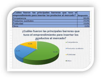 Se evidencia que un 59,4% por ciento de los resultados obtenido dice que el principal problema de la inserción de sus productos al mercado ha sido creada por la competencia puesto que existe muchos emprendimientos de la misma categoría, de la misma manera el 25% de los emprendedores recalca que existen muchos productos sustitutos, a veces a diferentes precios pero está dentro del emprendedor idealizar en su negocio y estandarizar su forma de trabajo y marketing, por otro lado el 15,6% de la población menciona que tuvo dificultades con la inserción de sus productos debido a la poca publicidad que realizaban, ya que si un producto tiene mayores probabilidad de poder ser vendido a los ciudadanos es a través de la publicidad y más en estos tiempos ya que la pandemia nos obligó a digitalizar y realizar publicidad a través de las redes sociales para una mayor seguridad.
