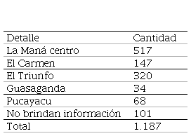 Se realizó el levantamiento de información mediante una encuesta en las tres parroquias urbanas, La Maná centro, El Carmen, El Triunfo y dos parroquias rurales, Guasaganda y Pucayacu del cantón La Maná, a todos los locales comerciales existentes en el Cantón, esto dando un resultado de 1.187 locales comerciales. Cabe mencionar que dentro de ellos existen 101 locales sin identificar, esto es equivalente al 8,51%.