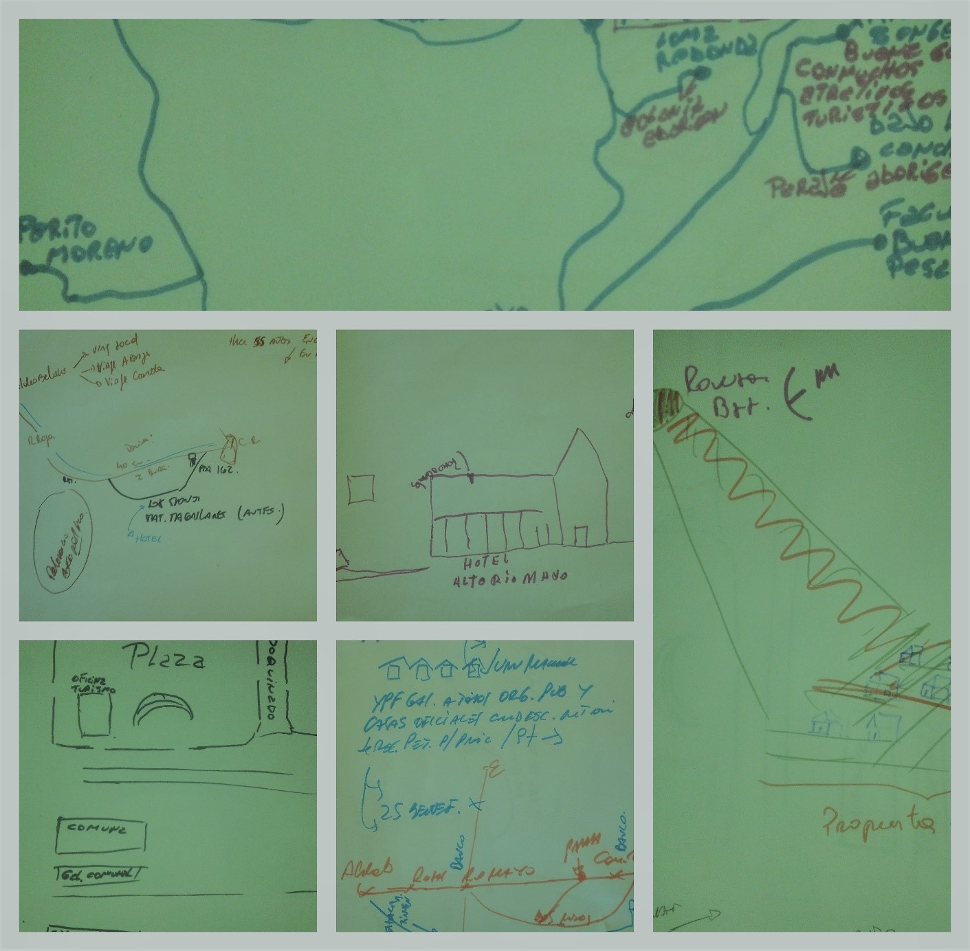 Al finalizar los tres viajes de trabajo en terreno, el equipo de trabajo realizó con el conjunto de entrevistas, sociocartogramas y dioramas, un proceso de socialización interna utilizando Cartografía Social. Esta cartografía (ver imagen 3) fue elaborada por quienes escribimos este artículo, y puesta a debate y discusión con los entrevistados que participaron de la investigación. El proceso así se puso en circulación para socializar ideas, nociones y lecturas en ese periodo de trabajo.
