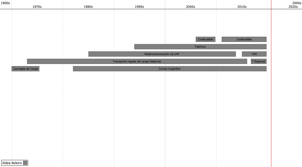 Podemos observar en el gráfico, la presencia tardía de los objetos en relación a espacios urbanos centrales. Este fenómeno es resaltado por Durston, Gaete y Pérez (2016), en referencia a la integración de nuevas tecnologías en la región de Aysén (Chile), que comparte límite con Argentina a la latitud de nuestra área de estudio. Allí los objetos tecnológicos como la electricidad, el teléfono fijo e internet se hicieron presentes en un breve periodo hacia finales del siglo XX y principios del XXI. Algunos como el transporte regular de larga distancia, se descontinuaron, así como la prestación de transporte y el expendio de combustible. Estos elementos fueron mencionados y dibujados en las entrevistas sociocartografiadas, como existencias que condicionan la movilidad y la dependencia con otros espacios geográficos, a los cuales se les suman la prestación de servicios de educación y salud. Así, en el siguiente esquema se presentan las existencias, posibilidades y prácticas en la región, vinculadas a la accesibilidad a servicios, la comercialización de objetos y las relaciones sociales.