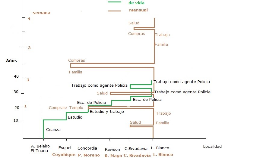 - Los dioramas, que fueron creados inicialmente por Hägerstrand (1982), muestran la trayectoria espacio-temporal de los individuos y, a través de ella, las interacciones entre los componentes de un espacio regional. Esa trayectoria espacio-temporal se representa en una línea trazada en función de dos ejes: un eje vertical con el tiempo organizado cronológicamente y un eje horizontal con los lugares vivenciados por el individuo durante el recorte temporal considerado (un día, una semana, un año, una vida, etc.). Un eje horizontal que a menudo se ha desplegado de modelos de elevación digital que contienen formas naturales y producidas del entorno del individuo. En este caso se consideraron dos escalas espacio-temporales en la elaboración de los dioramas, por un lado, los sitios de la localidad (escuela, sala de salud, viviendas, etc.) frecuentados durante la semana anterior a la entrevista y, por otro lado, los espacios (pueblos, ciudades, establecimientos rurales, etc.) vivenciados a lo largo de un año. Mientras que en la primera escala se observan las prácticas cotidianas dentro de la localidad, en la segunda se observan las movilidades y las permanencias fuera de la localidad y su distribución en días, meses y estaciones.
