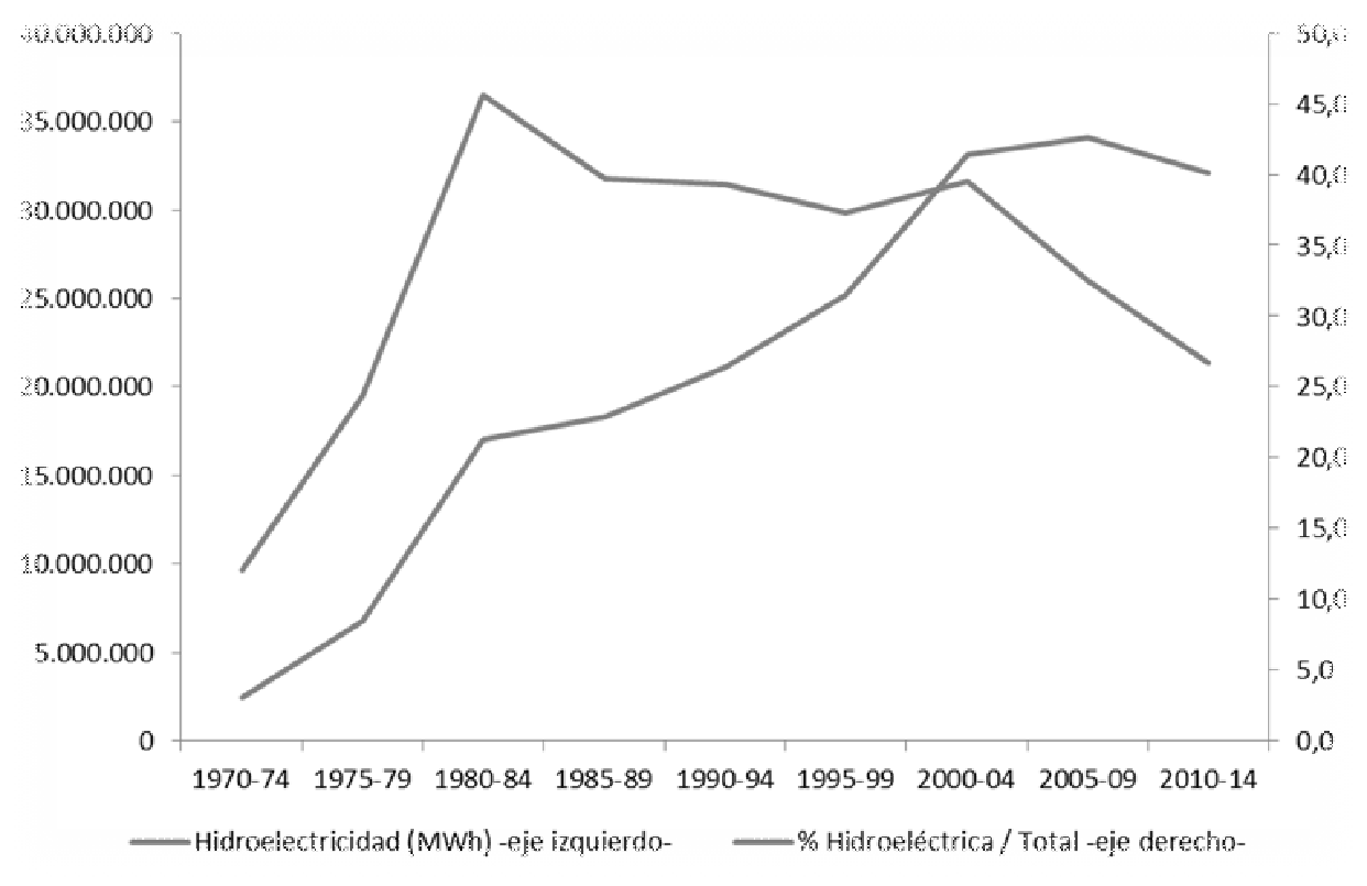 En el Gráfico 1 puede apreciarse la significación que alcanzó la hidroelectricidad a partir de la década de los 70: