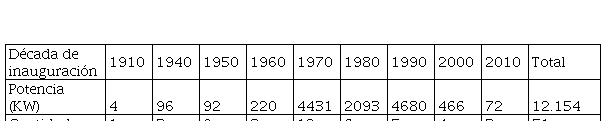 A la fecha de este trabajo Argentina posee 51 centrales hidroeléctricas en actividad. En conjunto generan 12.154 kilovatios (KW), que equivalen al 30,2 % de la energía eléctrica generada en el país. De ellas, como puede observarse en el Cuadro 1, la década de mayor construcción y potencia generada fue la de 1970. Cuatro centrales fueron inauguradas en Mendoza,[2] una en Chubut,[3] una en Córdoba,[4] una en Neuquén y dos entre Neuquén y Río Negro,[5] dos en Salta[6] y una en Entre Ríos y Salto en la República Oriental del Uruguay: Salto Grande. Esta central destaca por ser la única binacional y la de mayor potencia (1890 KW) hasta la inauguración de Yacyretá, la otra central binacional.
