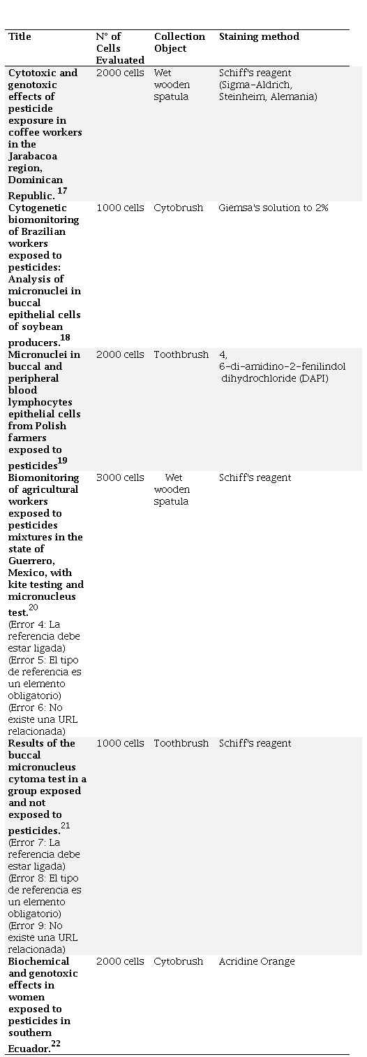 Abstract: Although there are several publications that refer to the basic criteria established for the micronucleus (MN) test in exfoliated buccal cells, there is still a difference in the quantity, method of obtention and staining of the cells for the evaluation of the presence of micronuclei. Objective. Identify the criteria for evaluation of MN in oral mucosa cells exposed to pesticide in investigations carried out. Material and methods. A systematic review was carried out on the internet, based on articles published in Crossref, JCR, Scopus, PubMed, Google academic, using keywords such as: micronuclei, buccal mucosa cells, genotoxic damage, pesticides and biomarker. Results. In the six selected articles, four presented statistically significant values with the presence of MN when comparing the exposed groups with respect to the control groups, and the criteria for staining, collection and number of cells evaluated to identify micronuclei were very varied. Conclusions. It is important to follow validated and standardized protocols for the MN oral cytoma assay. Being considered in all the parameters suggested in the protocol will increase the reliability of the studies and will give the possibility of comparing the results obtained.