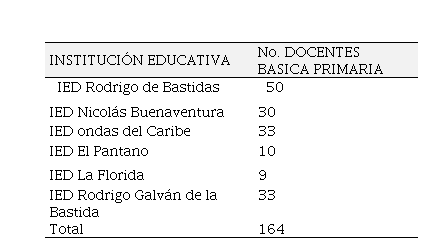 Se tomó como población 164 docentes de Básica Primaria de las Instituciones Educativas Distritales (IED) de la comuna 5 de la ciudad de Santa Marta, tal como se muestra en la Tabla siguiente:
