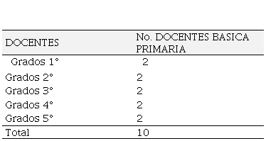 Siguiendo estos elementos, se tomó como muestra la Institución Educativa Distrital “El Pantano”, la cual está conformada por 10 docentes de básica primaria (ver Tabla 2).