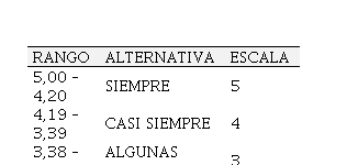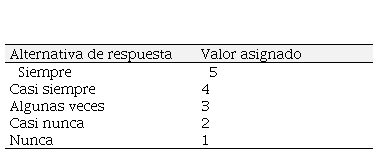 Se utilizó una escala ordinal tipo Likert, de carácter descriptiva y se le asignó un valor de uno (1) a cinco (5) a cada ítem, lo que permitió medir la variable estudiada. El puntaje fue asignado descendentemente desde la alternativa de respuesta “Siempre” con el mayor puntaje hasta “Nunca” con menor puntaje, como se muestra a continuación: