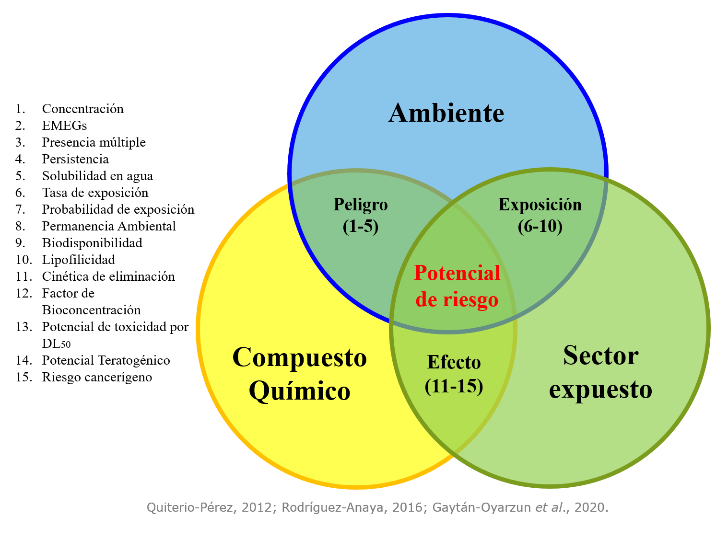 El siguiente instrumento de evaluación es parte de esta metodología de evaluación rápida, que permita discernir las diferencias entre factores ambientales, situacionales, del sector expuesto, así como propias de los compuestos químicos o elementos a evaluar, de manera individual o por interrelaciones entre cada una de ellas (peligro, exposición y efecto) (Fig. 1).