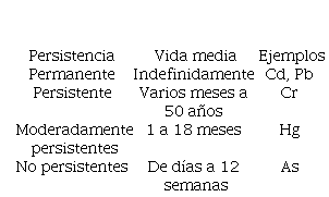 Peligro basado en su persistencia a través de su vida media en el ambiente: Se refiere al tiempo para que un compuesto químico alcance la mitad de su concentración en el ambiente, ya que a mayor temporalidad mayor peligrosidad ambiental (Ramírez y Lacasaña, 2001) (Tabla 1).