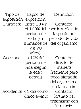 3) Probabilidad de exposición basada en su permanencia ambiental y su relación con el periodo de vida del sector expuesto: Este rubro se refiere al periodo de tiempo promedio que vive el sector expuesto en condiciones naturales, a mayor permanencia de un contaminante en el ambiente mayor será su probabilidad de exposición para el sector expuesto (MINAM, 2015).