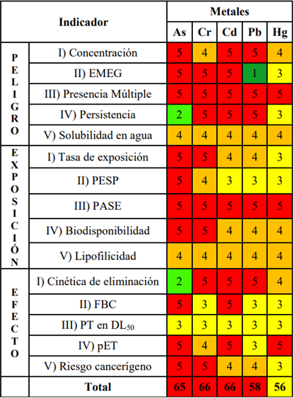 De acuerdo a los resultados obtenidos en el análisis de causa y efecto, se establecieron 15 indicadores con respuesta múltiple, con valores de respuesta de 1 a 5; en la tabla 3, se muestra la matriz de dos vías con las variables correspondientes a los indicadores imperativos de Peligro, Exposición y Efecto. Dentro de la matriz los valores que oscilan entre 1 y 5 se identificaron colorimétricamente de acuerdo al nivel de riesgo como se observa en la figura 2 de escala de puntuación. En la suma total de los valores por cada uno de los compuestos, la puntuación total para cromo (Cr) y cadmio (Cd) fue de 66, arsénico (As) de 65 y plomo (Pb) de 58, ubicándolos dentro de la categoría de Potencial de Riesgo Alto identificado con el color rojo (Figura 2); mientras que para mercurio (Hg) se presenta valor de 56 puntos respectivamente, ubicándolos en la categoría de Potencial de Riesgo Intermedio.