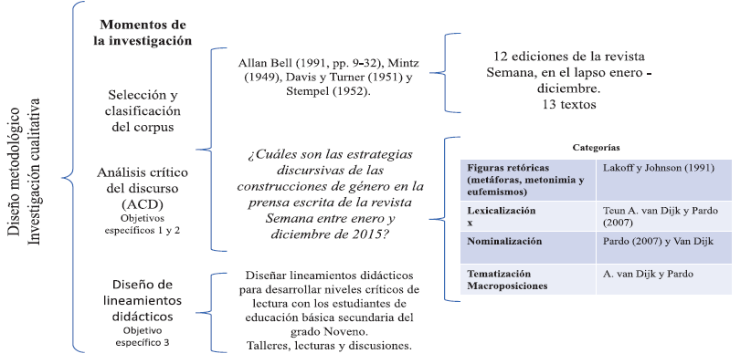 Esta investigación se inscribe en el paradigma del análisis cualitativo, al tener como objetivo el análisis e interpretación de los elementos discursivos de la prensa escrita en lo relacionado a categoría analítica: género, esta, concebida como una categoría social y simbólica en disyuntiva a lo sexual. Pérez (2001) citado por Quintana (2006) define la investigación cualitativa como “la comprensión de una realidad considerada desde sus aspectos particulares como fruto de un proceso histórico de construcción” (p. 48). Premisa, que permite el acercamiento desde las ciencias sociales, donde la realidad es construida, legitimaba y reproducida por el uso lenguaje. Por consiguiente, la investigación se desarrolla en dos momentos o fases: el primero, en la selección del corpus; el segundo, en la interpretación.