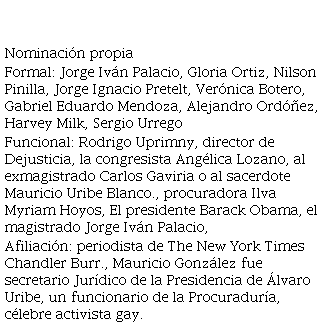 En todos los datos recogidos en la macrocategoria nominación propia formal, solo en algunas pocas ocasiones, se presenta, la excepción al nombrar de manera propia a los integrantes de la comunidad LGBTI (Ellos), tales como, Harvey Milk y Sergio Urrego. No obstante, al recurrir con la singularidad invierte este proceso y continua con el proceso de deshumanización, lo que pretende es legitimar unos rasgos de discriminación, violencia y presión que conlleva a la muerte no solo de los afectados sino de la comunidad en general; el primero, celebre activista gay estadounidense, asesinado en 1978, luchador por la libertad de expresión y los derechos sexuales en una época donde lo llamado “normal” se encontraba enraizado con más profundidad, el segundo, estudiante de Bogotà, D.C, el cual, se suicidio el 4 de agosto del 2014 por el bullying, ocasionado por su orientación sexual. Con el primer actor, el texto no menciona las causas del asesinato, únicamente expresa “dijo Harvey Milk poco antes de ser asesinado.”, aunque, de manera recurrente expresa su orientación y la lucha por el reconocimiento de los derechos de las personas homosexuales, por lo tanto, se insinúa que fue asesinado por el hecho de ser abiertamente homosexual, mas no, por razones, también, de carácter político, se menciona que era un activista mas no su carácter funcional: supervisor de San Francisco (EE.UU), omitiendo los conflictos políticos que envuelven el asesinato, y naturalizando el hecho, en una relación de causa: ser abiertamente gay y consecuencia: asesinado. En el segundo actor, Sergio Urrego, es traído a colación por parte del columnista en el apartado “–hago memoria de Sergio Urrego y de tantas víctimas anónimas—o de humillaciones en comunidades virtuales, en despidos laborales por condición sexual o la simple y muy común discriminación callejera.” Conforme con esto, se vincula al actor social (Urrego) con el adverbio de cantidad (tantas) con el fin de señalar de manera, general, el anonimato de manera explícita, al cual se encuentra inmersa el grupo alterno por vivir su sexualidad de manera distinta, en este caso, un joven de 14 años, únicamente fue visible al momento de suicidarse, pero toda su vida fue envuelta en discriminación y continuo rechazo, como él, aun, coexisten más víctimas.