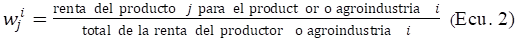 En las planillas constan los siguientes datos: alimento entregado, en seguida su valor bruto unitario, luego el valor neto unitario y al final de la planilla el valor bruto total. La renta bruta unitaria del agricultor i o agroindustria i es definida por la ecuación 1.