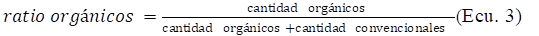 Para analizar la venta de productos orgánicos frente a la venta de productos convencionales, se ha utilizado el ratio entre orgánicos y convencionales (ecuación 3).