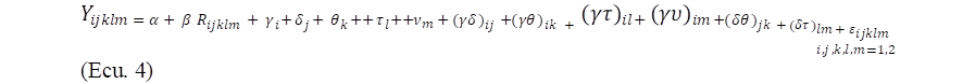 Para el análisis estadístico de los efectos de interés, se tomaron como respuesta la ordenación (ranks) de la variable renta y como variables independientes la ordenación (ranks) de la variable tasa de orgánicos y las variables binarias asociadas a los efectos. Dos formulaciones son consideradas: productores y agroindustria. Para los productores, el modelo estadístico considerado ha sido expresado en la ecuación 4.