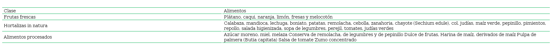 Para el análisis de los datos de los agricultores individuales, los alimentos han sido clasificados, en primer lugar, en cinco grupos de alimentos: alimentos procesados (conservas, productos higienizados, mermeladas, azúcar, miel, pulpa de frutas, etc.); frutas frescas y hortalizas in natura.