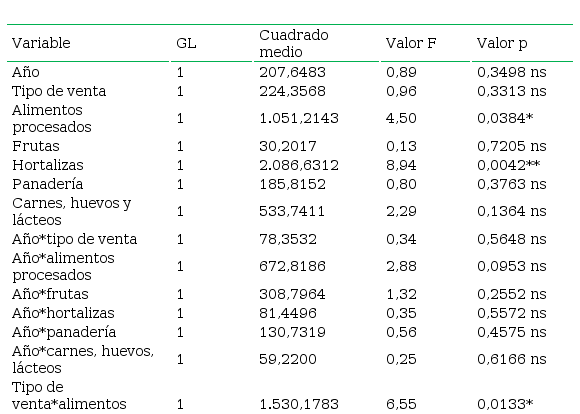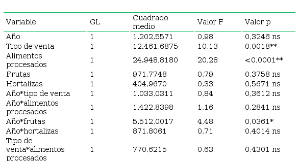 En la Tabla 3 se presenta la significancia estadística de los demás factores y de sus interacciones de segundo orden. Se infiere que: el tipo de venta y los alimentos procesados son significativos estadísticamente.