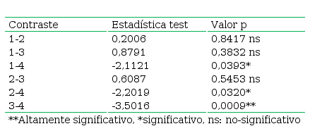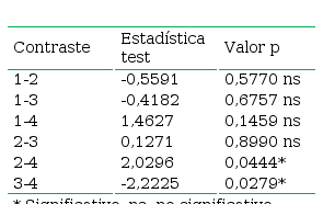 Hay diferencias estadísticas significativas para los contrastes (2-4) y (3–4).