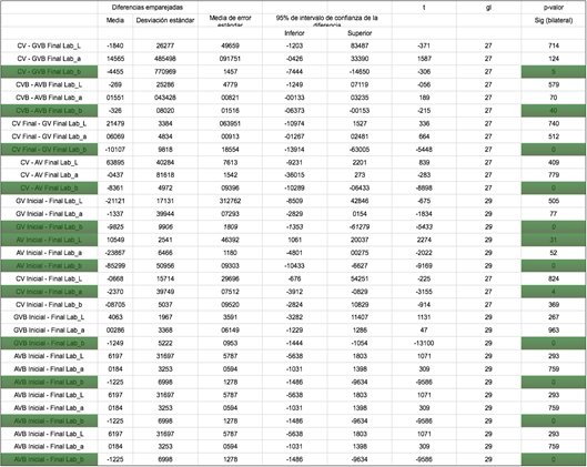 Analizando los valores L.a.b. individualmente, podemos identificar principalmente diferencias estadísticamente significativas para el grupo L.a.b._b (Tabla 5) con respecto a los valores a y L, lo que indica una variación del color en el rango de amarillo, mezclado con el tono rojizo del grupo a; forma un color secundario; según los valores obtenidos las muestras modificaron su color de blanco a marrón.