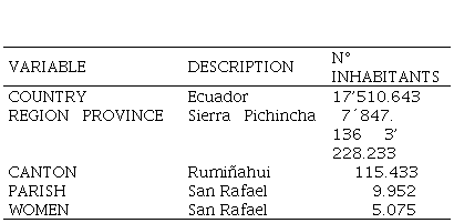 The project will be carried out in Ecuador in the Sierra region, in the province of Pichincha, Cantón Rumiñahui, where INEC, according to projections for the year 2020, estimates that there will be 115,433 inhabitants. The market study is focused on the Parish of San Rafael, where there are 9,952 inhabitants, of which 5,075 are women. See Table 1